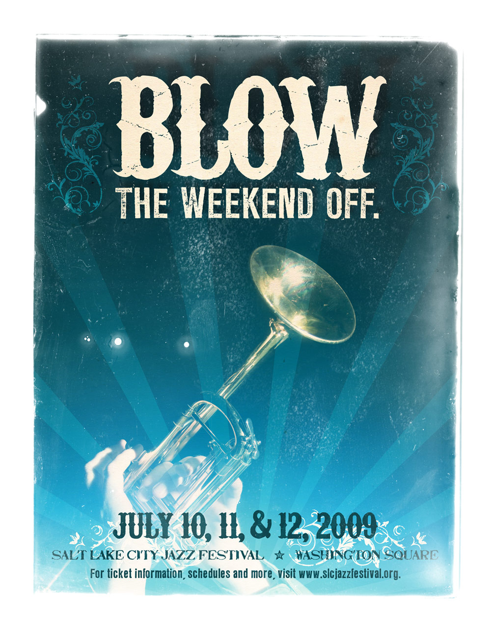 When tasked with coming up with an ad campaign for the Salt Lake City Jazz Festival, the idea for playing with different jazz instruments as the basis for the concepts came up very early.  Working with photographer Jamie Jones, we selected three different instruments and then I created the concept for the headlines based on the different items, each headline taking a “have some fun at the jazz festival this weekend” position for the messaging.  We ended up with a set of ads, one full-color magazine, one black and white newspaper and one full-color billboard ad.