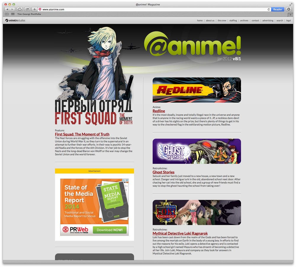 @anime! is an online magazine that features stories and articles about anime and manga, Japanese animation and comics. In this last version of the site design, I was looking to simplify the programming and maximize the ability to update the site quickly for new issues of the magazine. With a magazine setup, getting at the information quickly and easily is essential. There were several page layout setups that were used, some of them based on older versions of the site. The newer pages in the design were kept simple, with blocks of text in the articles broken up with larger images in places to help enhance the magazine aspect of the site.